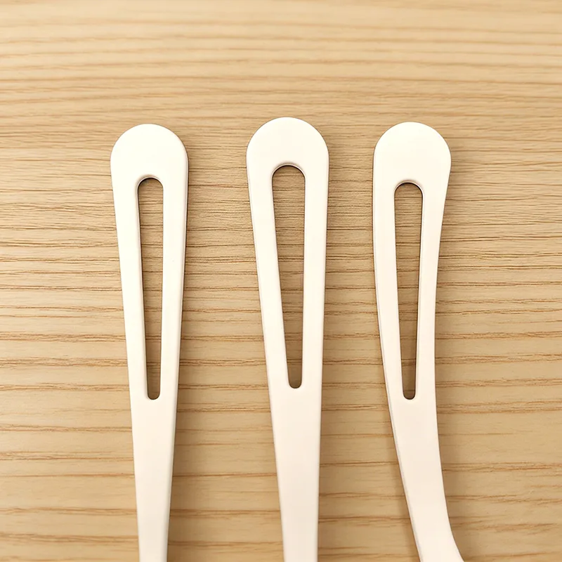 Ympäristöystävälliset pisaranmuotoiset muoviset ruokailuvälineet kestävät sekä lämpöä että kestävyyttä. Veitsen, haarukan ja lusikan rakenne on vakaa, haarukan piikit terävät ja kahva sileä. Se käsittelee helposti erilaisia ruokia, kuten lämpimiä ruokia ja jälkiruokia, tarjoten perinteisten muovisten ruokailuvälineiden mukaisen käyttökokemuksen. Muotoilu on yksinkertainen ja tyylikäs, puhtaan valkoisen sävyn avulla, joka sopii erilaisiin ympäristöystävällisiin catering-yrityksiin, teematapahtumiin ja perheen ruokailuskenaarioihin. Hännän ontto muotoilu ei ole vain ainutlaatuinen muotoilun kohokohta, vaan myös käyttäjien on kätevä pitää ja ripustaa, mikä tasapainottaa sekä estetiikkaa että käytännöllisyyttä.