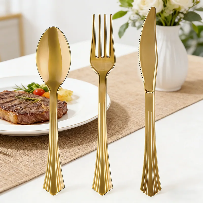 Jos tarvitset Premium Fishtail -muovisten ruokailuvälineiden hinnaston, etsi Ningbo Powerr Plastic Products Co., Ltd, joka on ammattimainen valmistus Kiinassa. Tämä setti piilottaa hienostuneisuuden yksityiskohtiinsa. Ruokailuvälineiden päissä on ainutlaatuinen 3D-viuhkamainen konvergenssimuotoilu, jonka sileät reunat muodostavat tyylikkään kalanhäntäkaarevuuden, mikä takaa kämmenystävällisen otteen ja veistoksellisen ilmeen. Tasainen kullanvärinen pinnoite luo hienovaraisia vaaleita ja tummia kerroksia antaen muoville huomattavan metallin tuntuisen, kun taas harjanteet lisäävät sekä koristelua että liukumattomuutta varmistaen tukevan pidon myös rasvaisilla käsillä. Yhtenäinen kullattu tyyli, joka yhdistetään usein yhteensopivien kultaisten kertakäyttökuppien ja -lautasten kanssa juhlasarjana, kohottaa kattauksia. Ihanteellinen allasjuhliin, grilleihin, häihin tai tiiminrakennustapahtumiin, sen kertakäyttöinen muotoilu tarjoaa mukavuuden tinkimättä eleganssista, mikä tekee hienostuneisuudesta ja käytännöllisyydestä saumattomasti yhteensopivia.