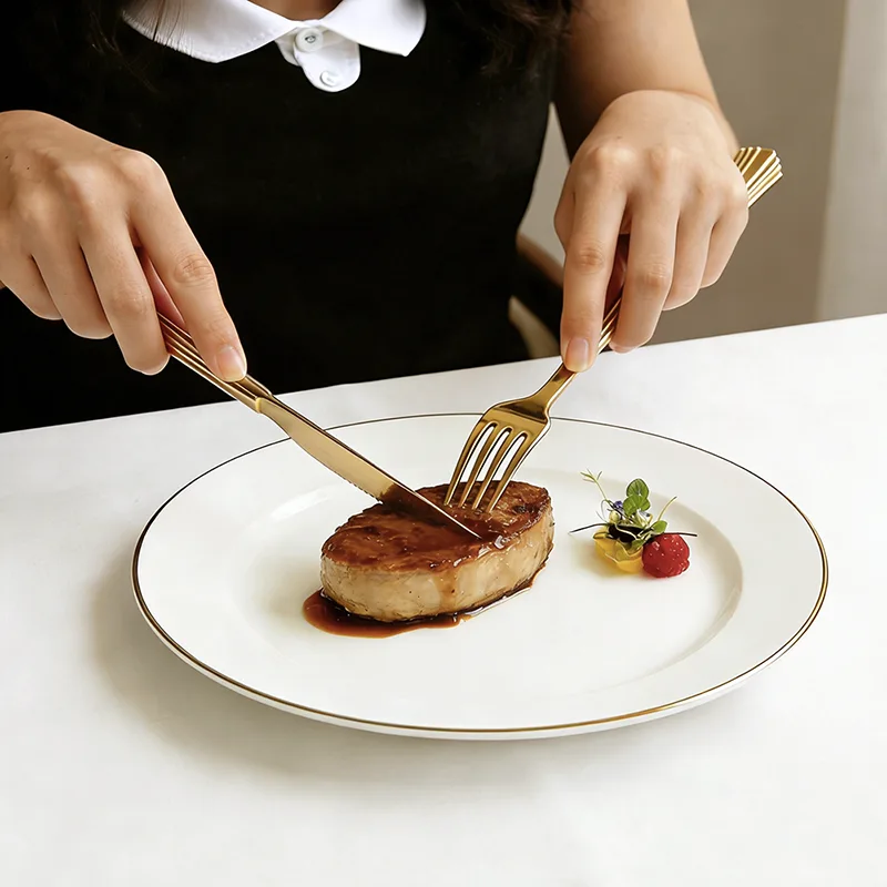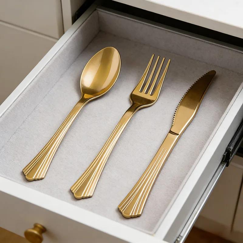 Kultainen pinnoite peittää tasaisesti jokaisen reunan, jolloin astiasto heijastaa herkkää valoa ja tummia sävyjä valon alla. Se mahdollistaa muovimateriaalin tekstuurin yhtä merkittävän kuin metallisten astioiden, mikä eliminoi täysin halvan tunteen.