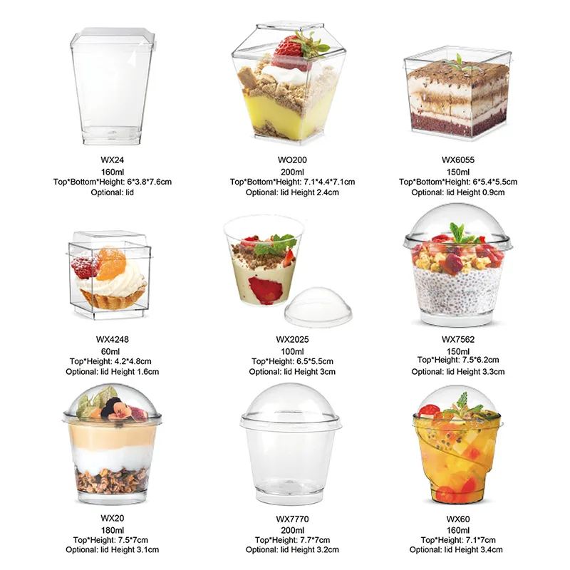 Toisin kuin perinteiset lasituotteet, erikoismuotoiset jälkiruokamuovikupit on valmistettu läpinäkyvästä elintarvikemuovista. Samalla kun visuaalisen näytön laatu säilyy, se tuo myös suurta mukavuutta kuljetukseen. Käyttäjät voivat pakata jälkiruoat kätevämpään paikkaan ja kuljettaa ne sitten juhlapaikalle ilman tuotantoa paikan päällä. Tämä on erittäin ystävällinen ulkoiluun ja suuriin tapahtumiin.